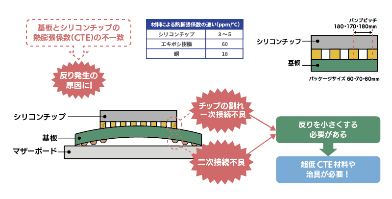 半導体のシリコンチップとパッケージ用のプリント配線板(基板)とでは熱膨張係数(CTE)が大きく異なります。