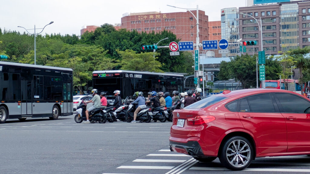 台湾は原付バイクの台数が多い交通文化で北門駅近くの大きな交差点では集団になって信号待ちをしている様子が見られました。